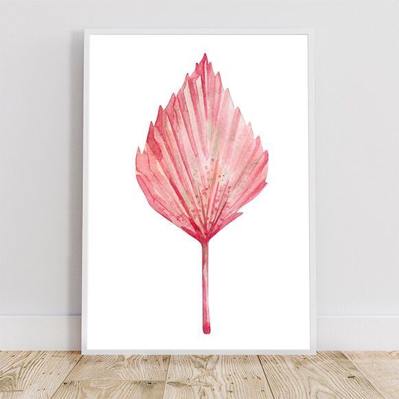 ピンクのトロピカルなドライヤシの葉の水彩画。シンプルでミニマルなお部屋作りに。