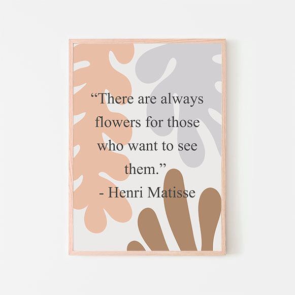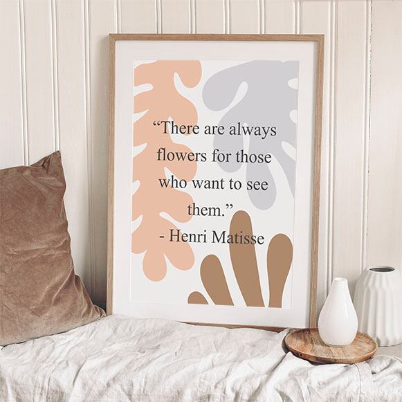 植物の葉をモチーフにした形を組み合わせたイラストに、フランスの画家、アンリマティス(Henri Matisse)の名言を組み合わせました。目に優しいカラーを使ったナチュラルな印象でどんなお部屋にも馴染みます。