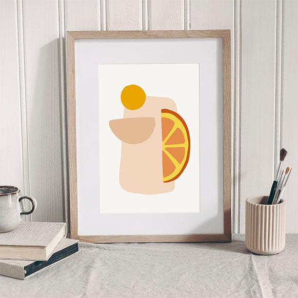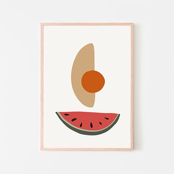 すいか(西瓜)とオレンジをモダンなシェイプと共に描いた夏らしいイラストの2枚組。お部屋をトロピカルでモダンに彩ってくれます。