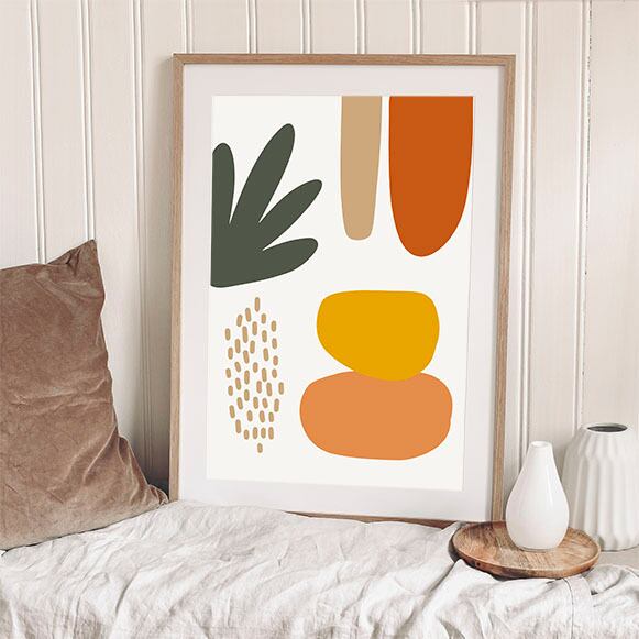 パパイヤをモダンなシェイプで描いた夏らしいイラストと、ヤシの葉などを取り入れたアブストラクトな植物のイラストの2枚組。お部屋をトロピカルでモダンに彩ってくれます。