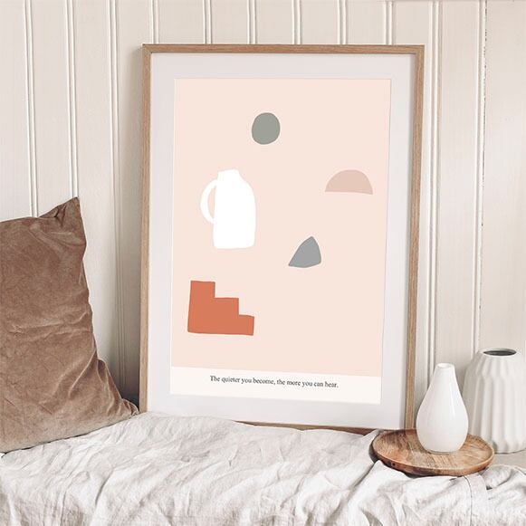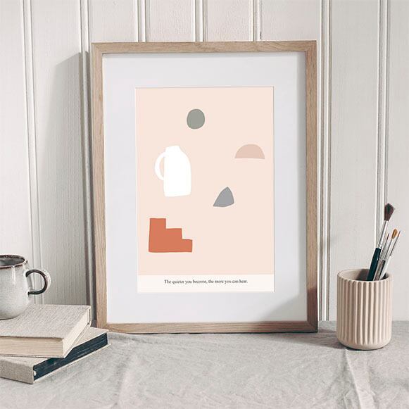 ”The quieter you become, the more you can hear.”のミニマリスティックで哲学的な文字が入った、ミニマルな形を散りばめた絵。