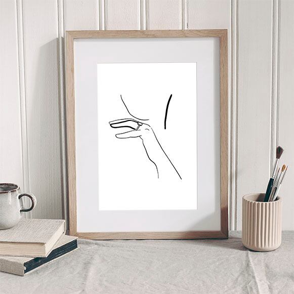 線で描いた、指輪をした女性の手と顔の一部。ミニマリストにぴったりな一枚。インテリアに馴染むシンプルな構図も良いですね。