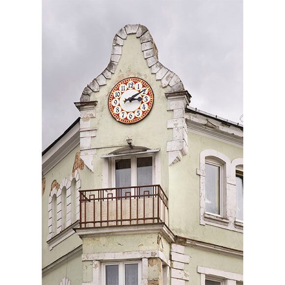 ユニークな時計のある古い家。パステルカラーのポーランド的な雰囲気が可愛いレトロな一枚。