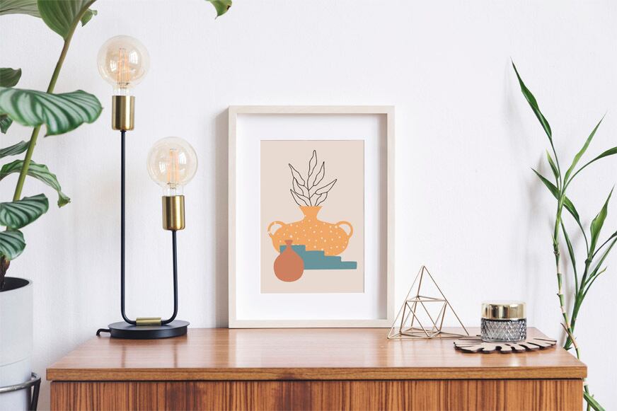 花瓶や植物を描いた抽象的なイラスト。どんな空間にも最適なミニマリスティックな一枚です。