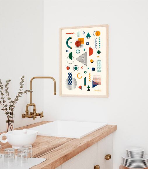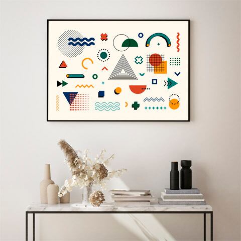 幾何学的な模様を集めたメンフィスデザイン。面白いアイデアが思い浮かびそうなクリエイティブな一枚。