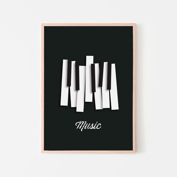 ピアノをモチーフにした"music"の文字入りポスター。音楽専用の部屋はもちろん、どんな空間にも飾れるシンプルなデザイン。