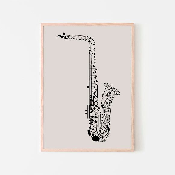 音符で構成された、おしゃれなサクソフォンの絵。音楽専用の部屋はもちろん、どんな空間にも飾れるシンプルなデザイン。