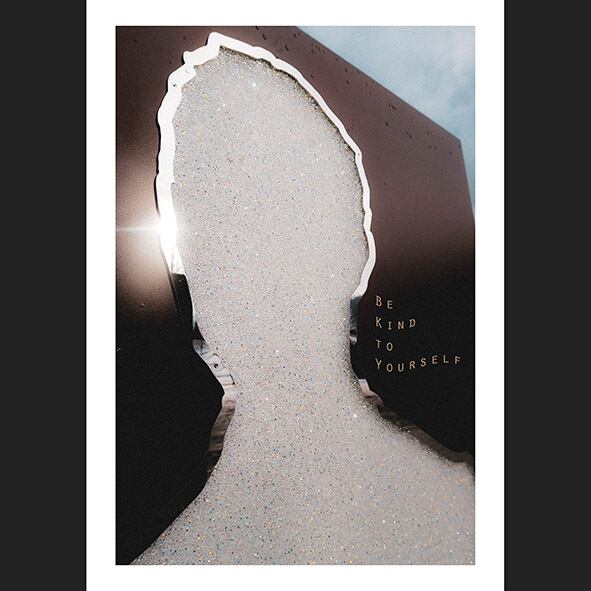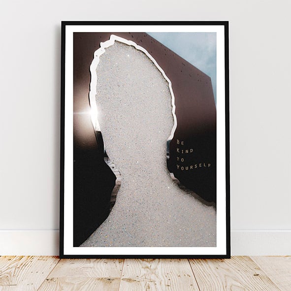 "BE KIND TO YOURSELF"(自分に優しく)ポスター。