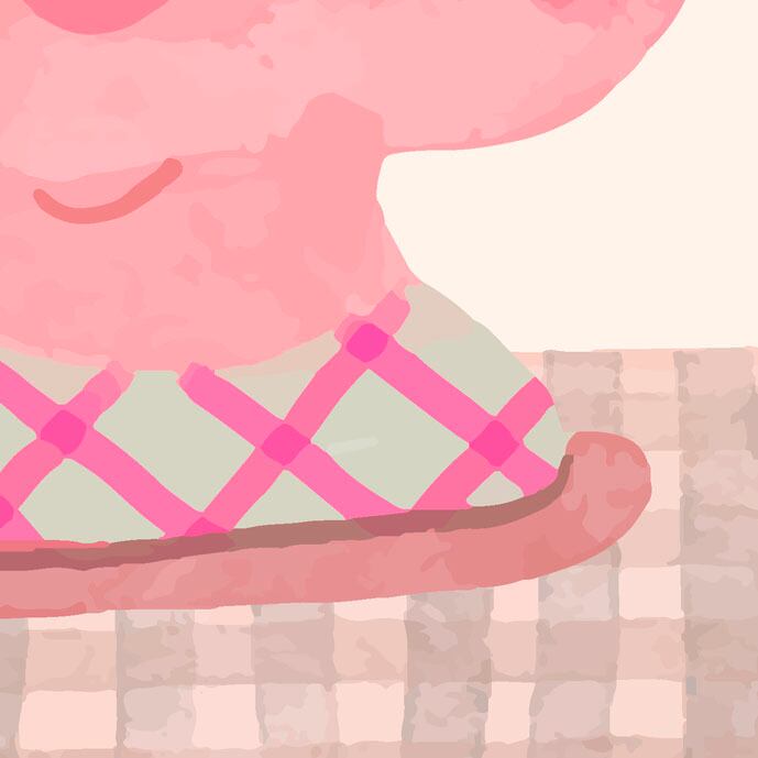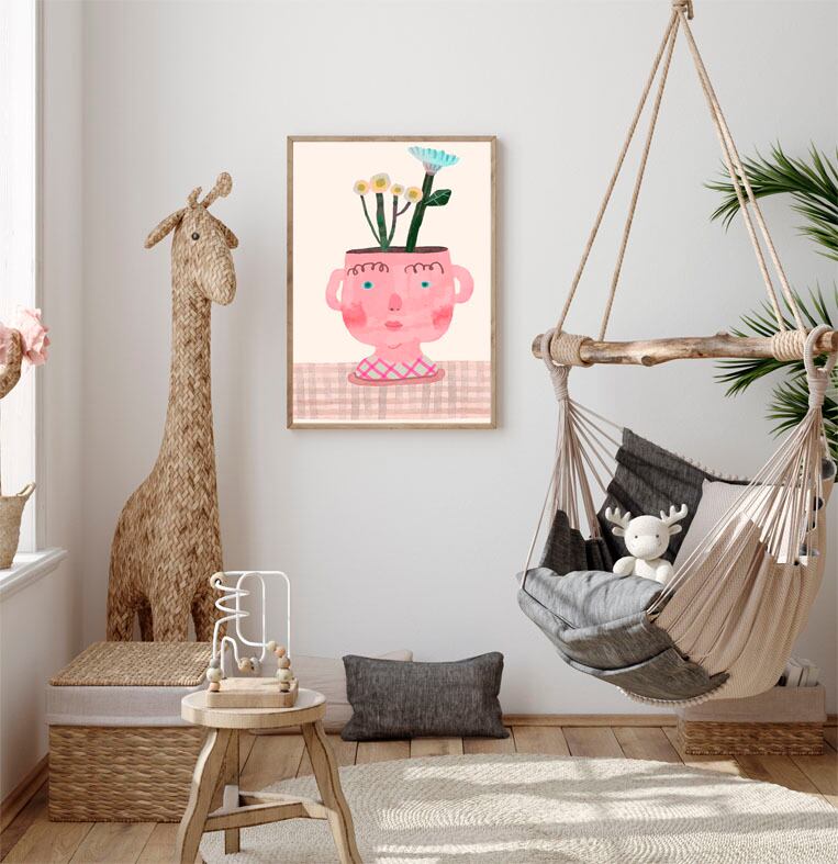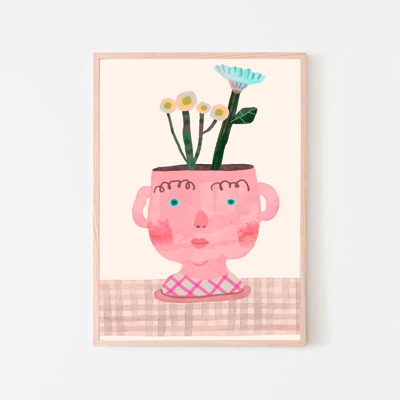 アートポスター 花 顔 イラスト 絵 縦長 チェック ピンク