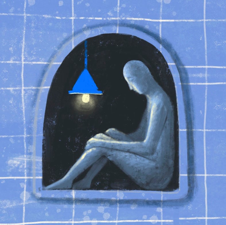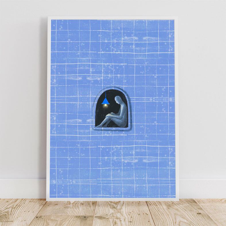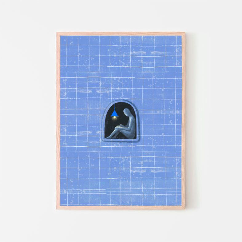 アートポスター イラスト 人 絵 縦長 チェック ブルー ホワイト ライト ランプ