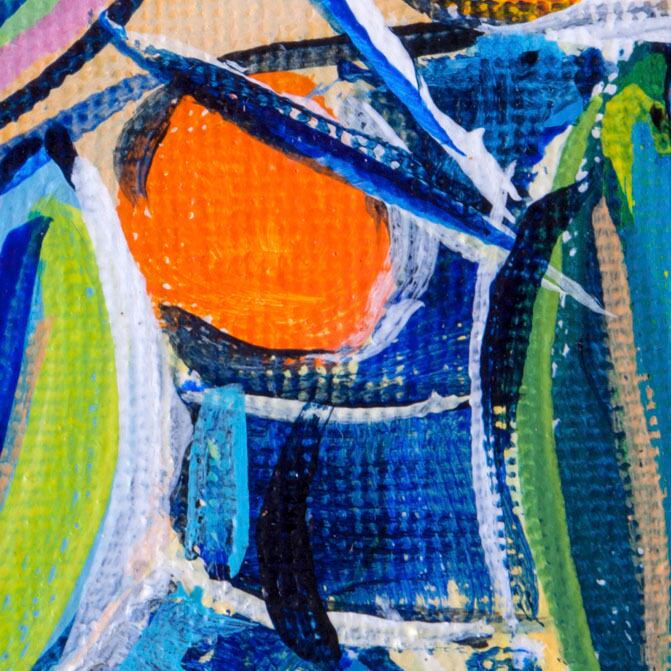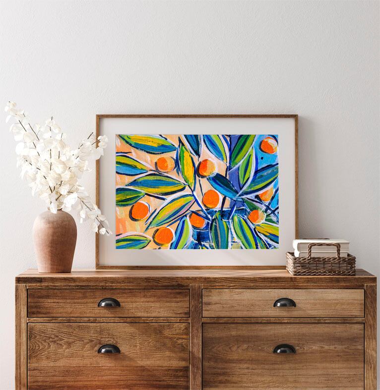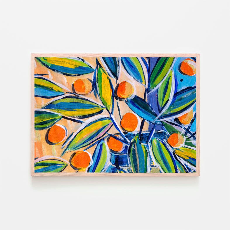 アートポスター 絵画 横長 オレンジ 果物 フルーツ 葉 ブルー アクリル フォービズム